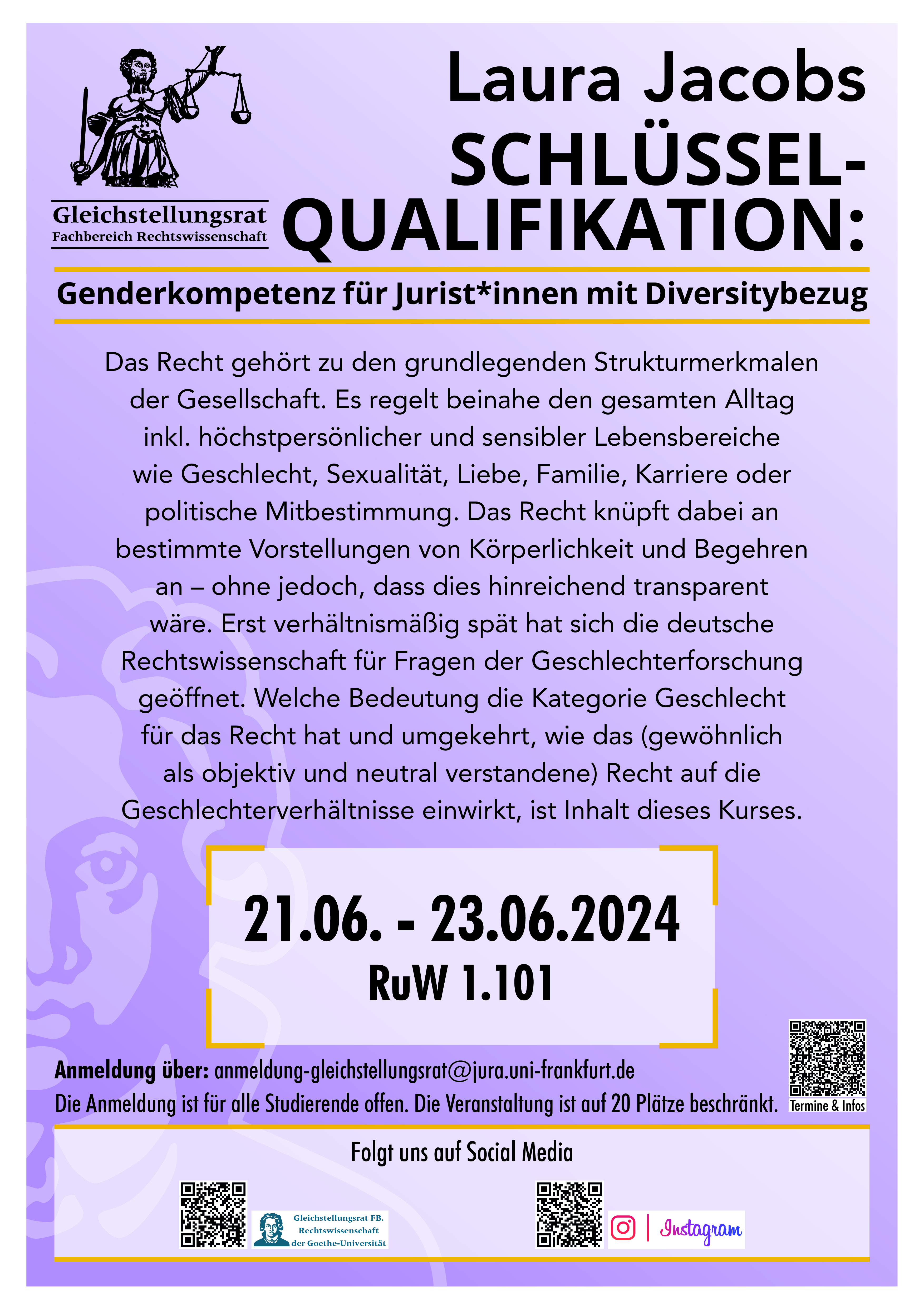 ** Schlüsselqualifikation "Genderkompentenz für Jurist*innen mit Diversitybezug" mit Laura Jacobs.