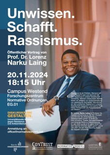 Rassismus ist ein Problem. Niemand will ein*e Rassist*in sein und dennoch hält sich Rassismus in unserer Gesellschaft hartnäckig. Welchen unbewussten Beitrag leisten wir alltäglich zur Aufrechterhaltung von rassistischer Normalität? Wie können wir dem politischen Rassismus in unserer Gesellschaft begegnen? Und welche Rolle spielen Hochschulen als Produktionsorte von Wissen? Prof. Dr. Lorenz Narku Laing wird in seinem öffentlichen Vortrag neue Perspektiven auf Rassismus und Antirassismus entwickeln. Dabei will er nicht nur informieren, sondern auch unterhaltsam sein. Er lädt dazu ein, sich gemeinsam auf eine antirassistische Reise für das Wohl unserer Gesellschaft zu begeben, fußend auf aktuellen wissenschaftlichen Studien.